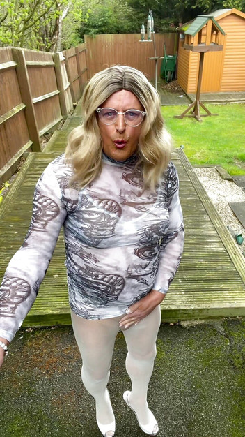 Amateur Crossdresser Kellycd2022 sexy milf peeing in my white seamless pantyhose and heels outdoors masturbation sissy